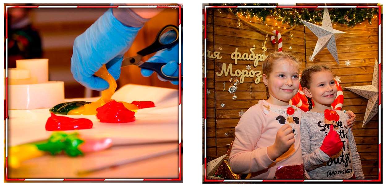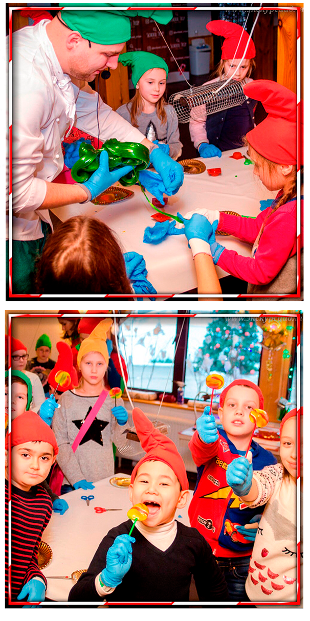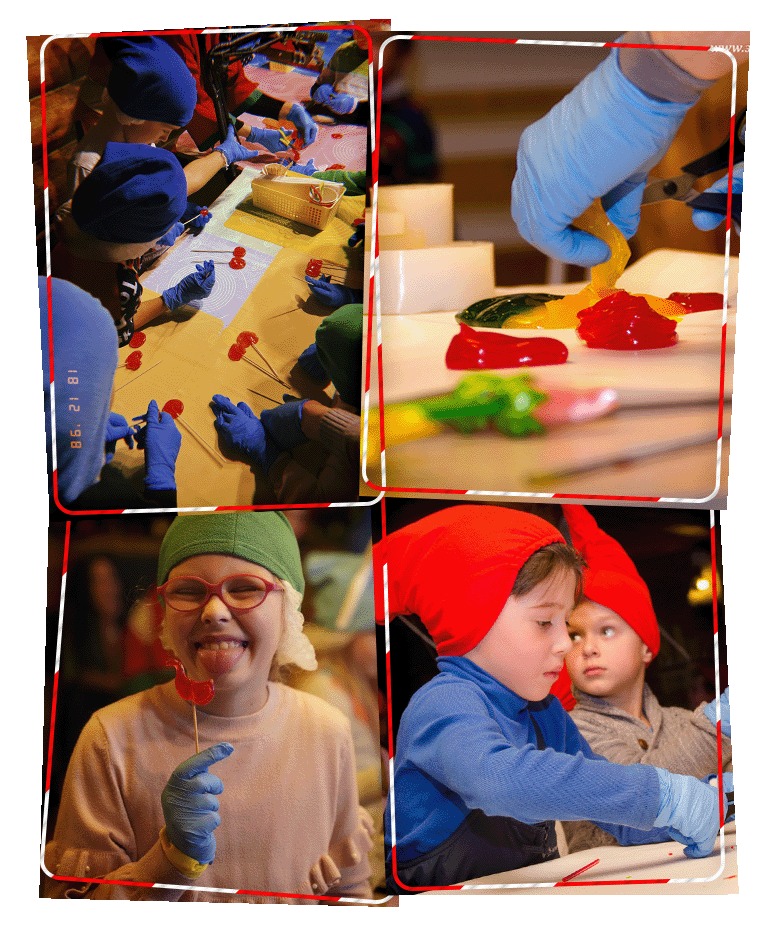 Дети в колпачках гномов под руководством гномов-карамельщиков собственноручно приготовят красивые леденцы разных форм, которые смогу забрать с собой